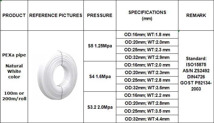 Junxing PEX is a cross-linked polyethylene (PEX) product.Cross-linked polyethylene (PEX) tubing provides excellent chemical and corrosion resistance, making it ideally suited for harsh water conditions or aggressive installation environment. Standard: GB/T18992-2003, ISO15875, DIN4726